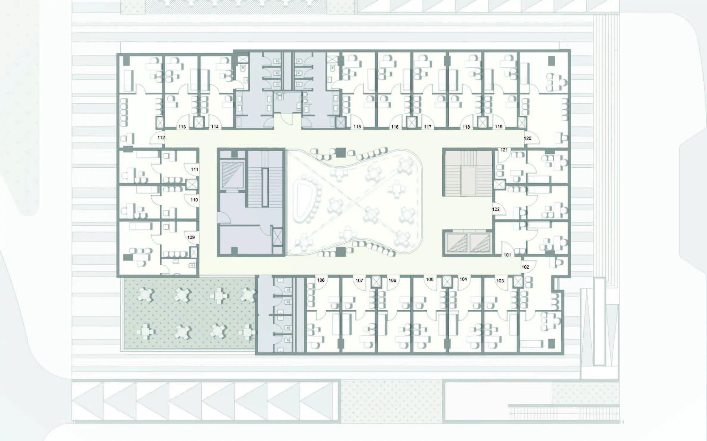 • جراجات سيارات واسعة وتنظيم مروري داخلي مريح مع مساحات مفتوحة وجلسات خارجية تضيف طابعًا عصريًا للمشروع
